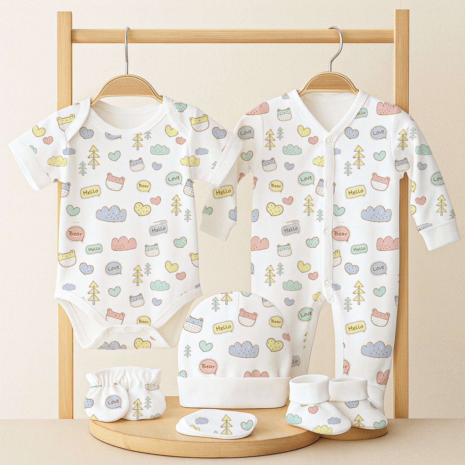 Includes: 1 Romper, 1 Onesie, 1 Cap, 1 Pair of Mittens, 1 Pair of Bootie, 1 Bib, Cushioned Nappy