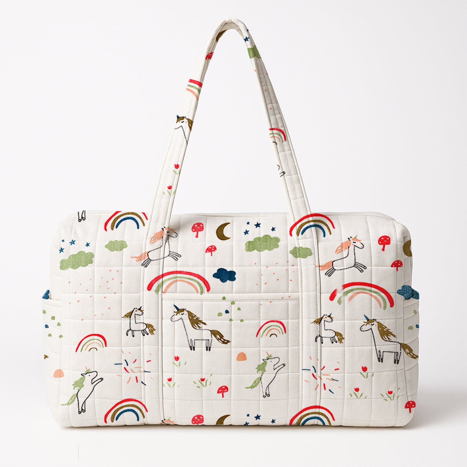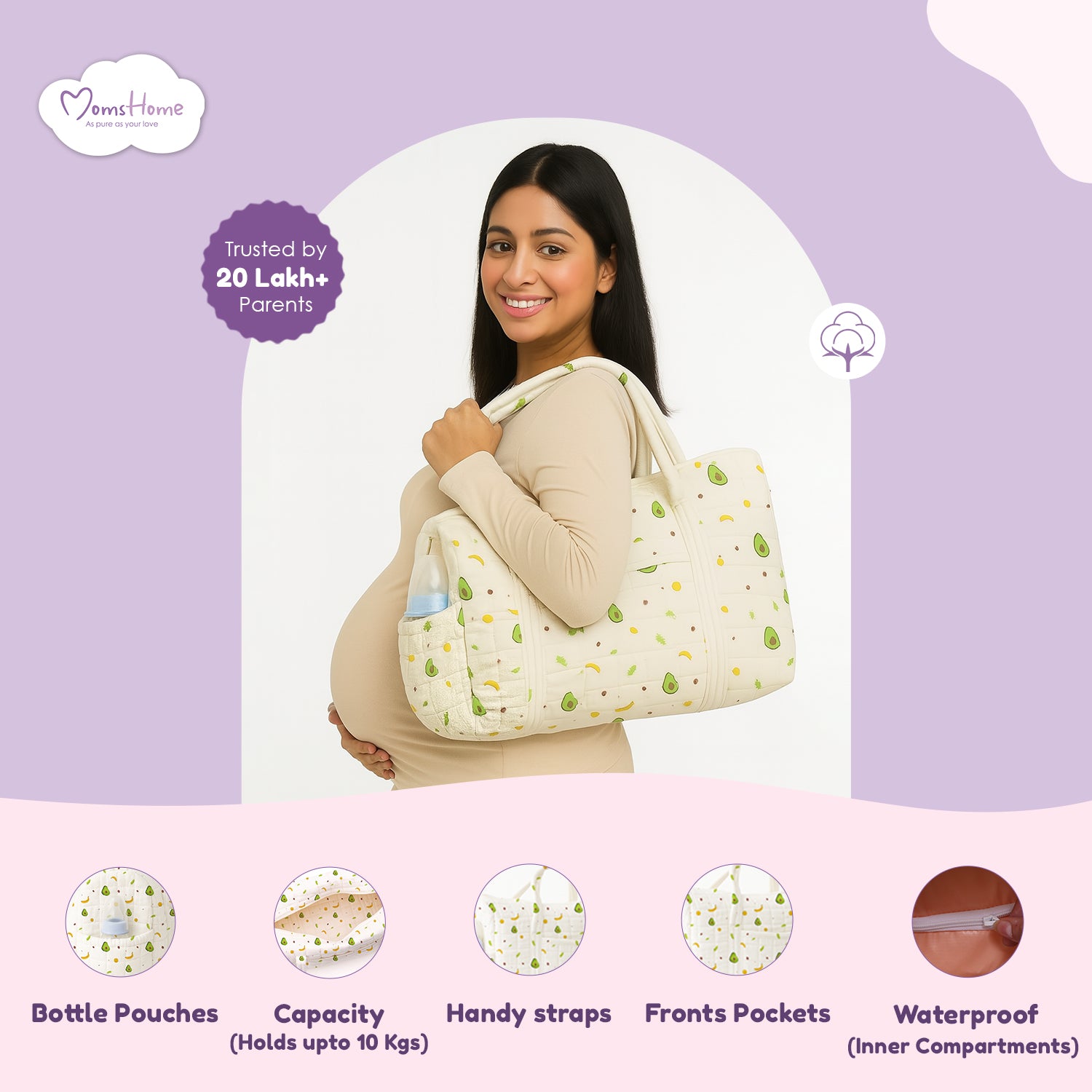 This diaper bag offers a large space and multiple compartments to store newborn essentials and mommy items. It features a wide-open main compartment with a zipper closure, a front parent pocket for quick access to baby items and bottle pouches on both sides, a zippered waterproof pocket for wet clothes or towels, and easy-access compartments inside for toys, diapers, or wipes. Its handy straps make it perfect for any travel time, from a trip to the park to a long journey. Made from lightweight cotton with quilted detailing, it’s great as a hospital or travel bag and makes a thoughtful gift for new moms. Plus, the waterproof interior pocket ensures no worries about spills.