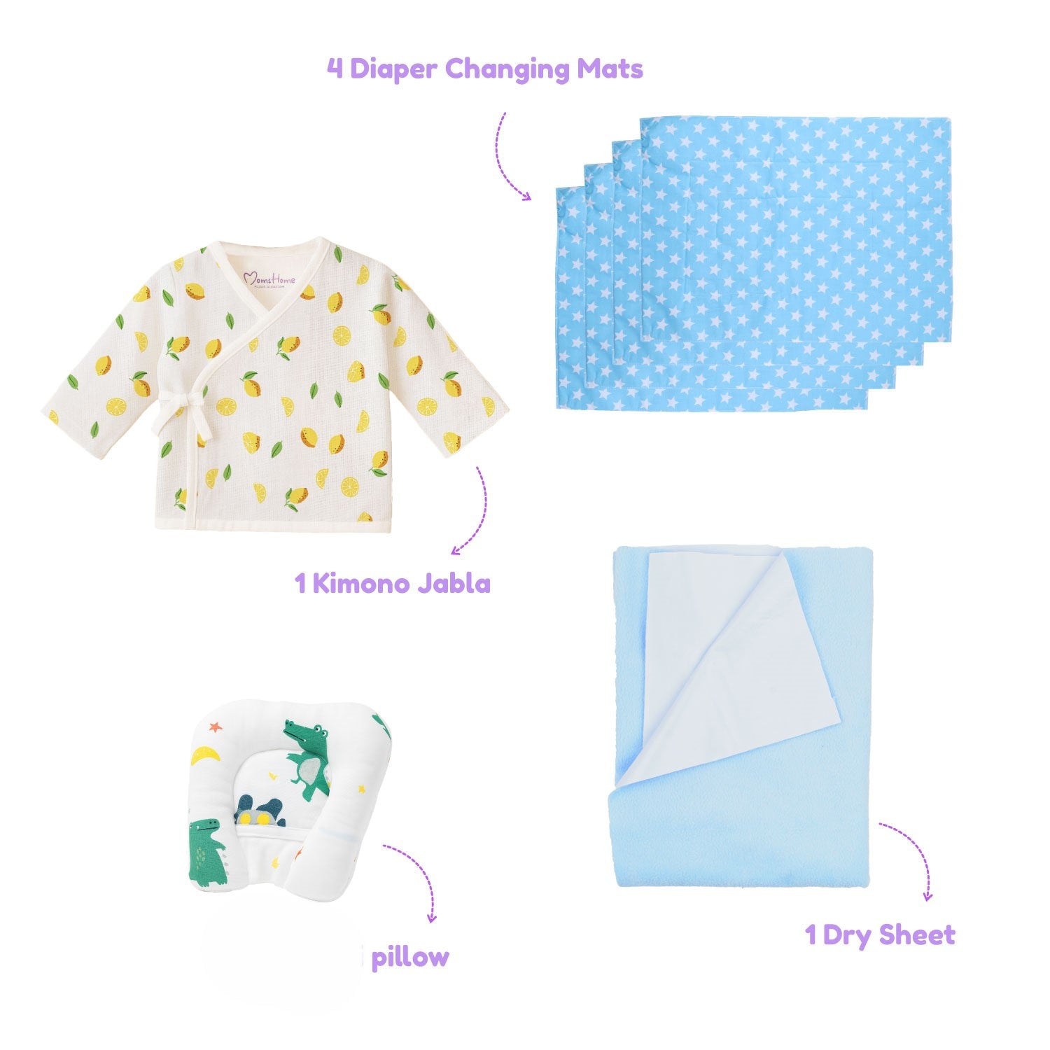Includes: 1 Cotton Blanket, 1 Newborn Dress, 1 Dry Sheet, 1 Head Shaping Pillow, 3 Muslin Swaddles, 3 Onesies, 3 Caps, 3 Pairs Mittens, 3 Pair Booties, 3 Cushioned Nappies, 3 Socks, 3 Wash Clothes, 3 Burp Clothes, 1 Diaper changing mat (4 Sheets)