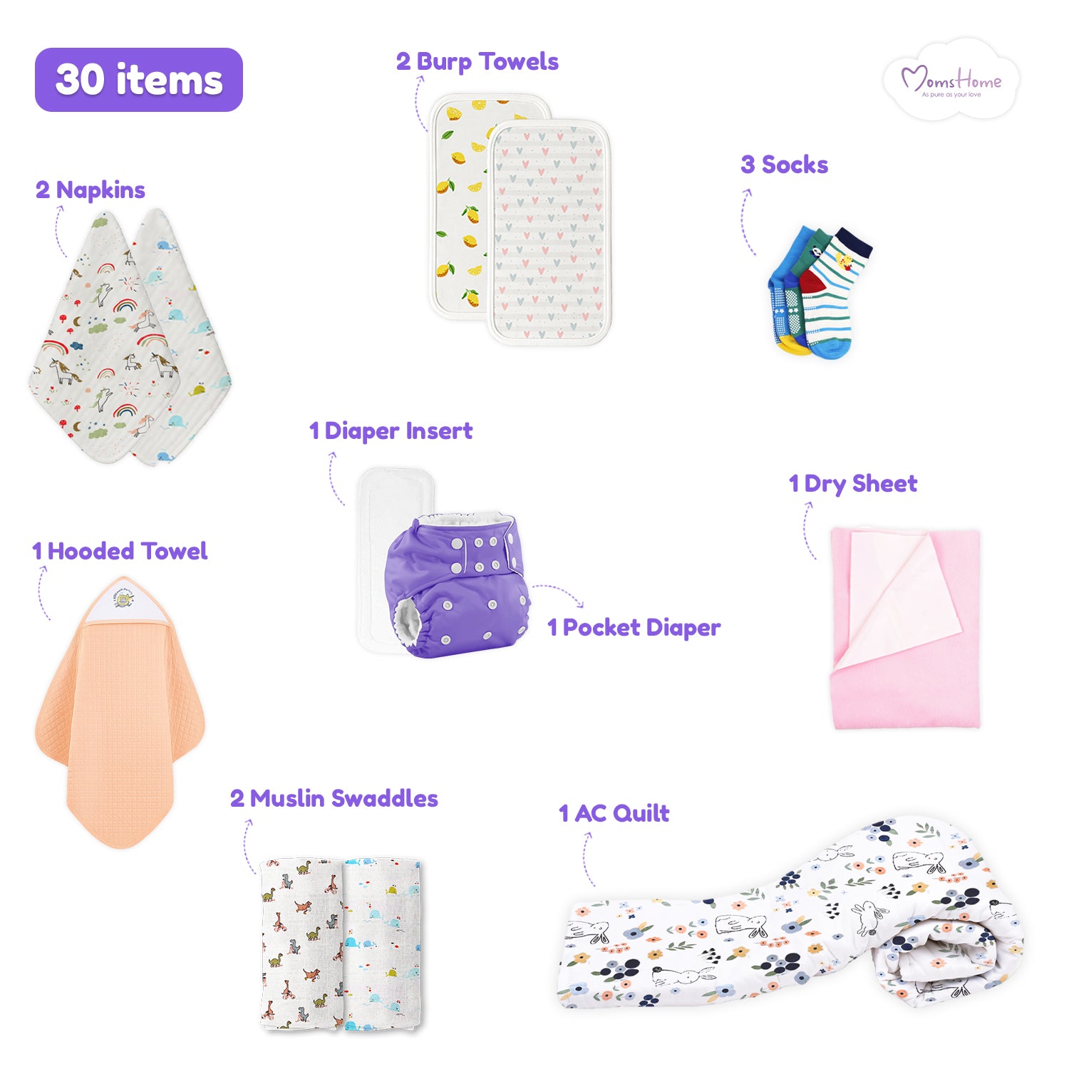 Includes:- 2 Muslin Swaddle, 1 AC Quilt, 1 Hooded Towel, 3 Cushioned Nappy, 3 Socks, 2 Wash Clothes/Napkins, 1 Dry Sheet 70*100, 2 Burp Towel, 1 Velcro Swaddle, 1 Pocket Diaper, 1 Diaper Insert, Cotton Baba Suit (1 T-shirt & 1 Pajama), 2 Antiskid Bootie Socks, 1 Quilted Baby Suit (T-shirt & Pajama), 2 Caps, 2 Pair mitten, 2 Pair bootie sets.