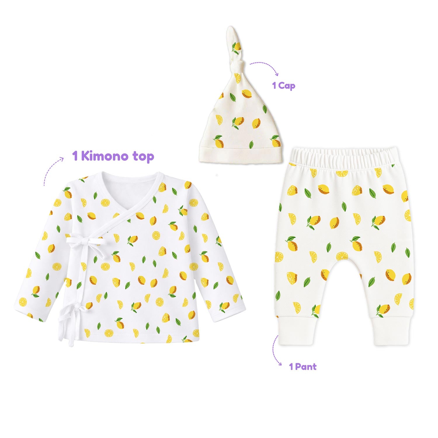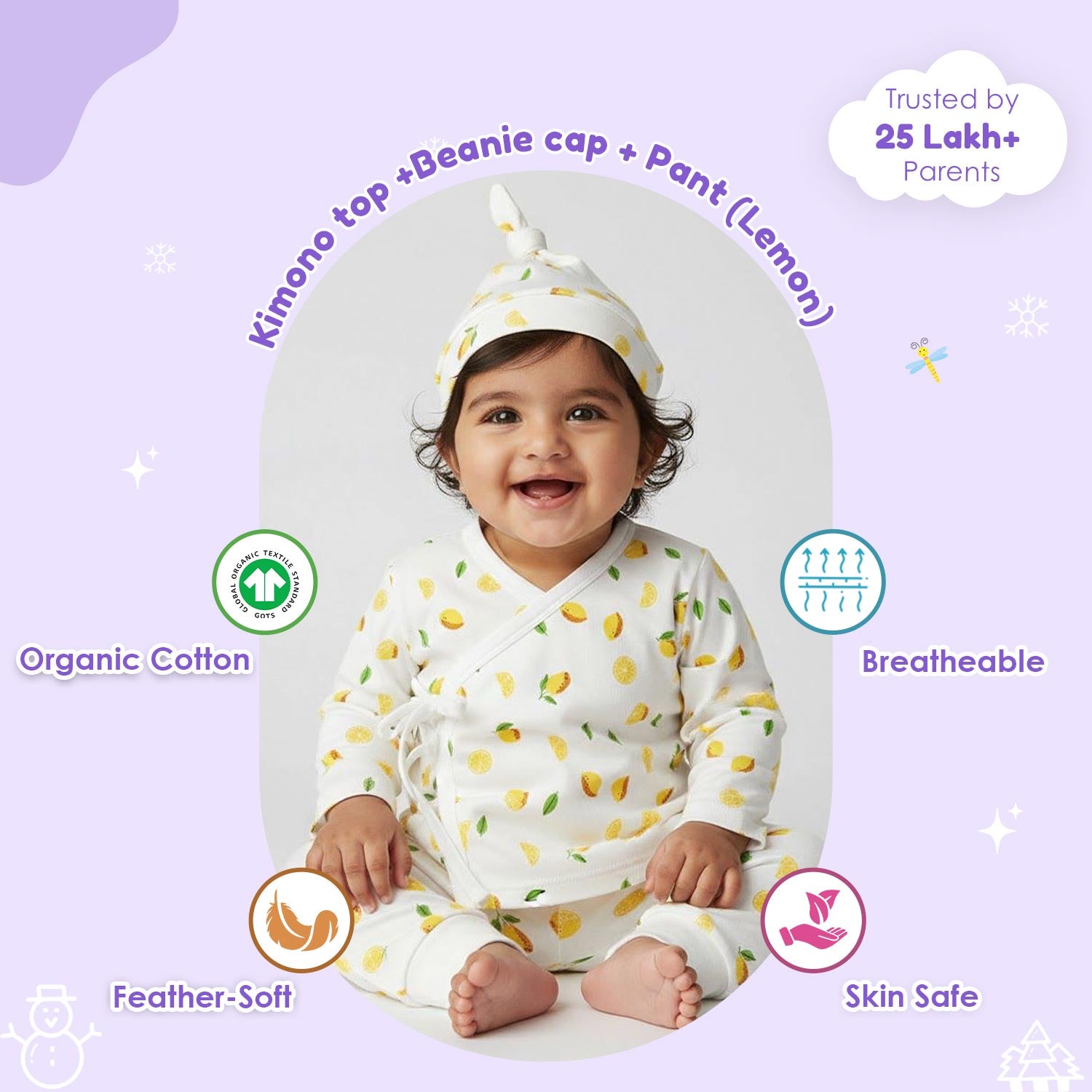 Give your little one the softest start with this Organic Cotton Newborn Baby Clothing Set, thoughtfully designed for delicate newborn skin. This premium baby shower gift hamper includes a kimono-style top, cozy pyjama, and a matching cap, making it a complete everyday essential for babies aged 0–6 months.
