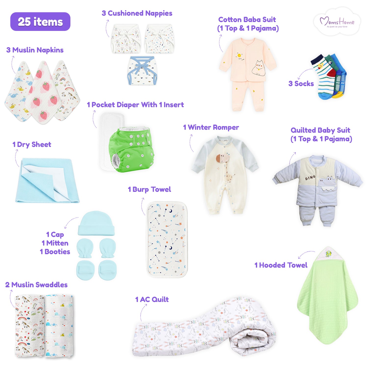 Includes: P1 Winter Romper, P1 Cotton Baba Suit (1 Top & 1 Pajama), Quilted Baby Suit (1 Top & 1 Pajama), P2 Muslin Swaddle, P1 AC Quilt, P1 Hooded Towel, P1 Pocket Diaper With 1 Insert, P3 Cushioned Nappy, P3 Muslin Napkin, P3 Socks, P1 Dry Sheet, 1 Cap, 1 Mitten & 1 Booties, P1 Burp Towel.
